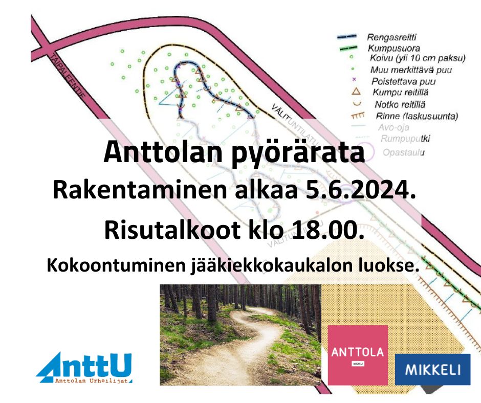 Anttolan pyräradan rakentaminen käynnistyy ke 5.6.2024. Rata tulee koulun välituntiladun keskiosaan. Muutama puu pitää kaataa radan tieltä. Anttolan Urheilijat ry ja aluejohtokunta järjestävät risutalkoot 5.6. klo 18.