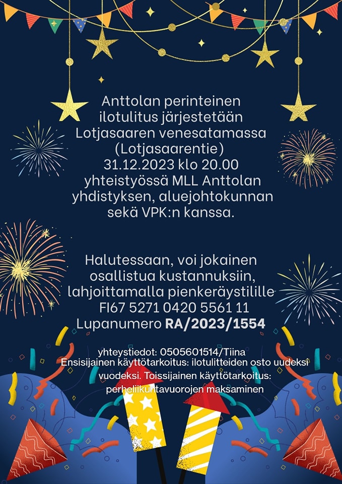 Uuden vuoden ilotulitus järjestetään 31.12.2023 klo 20.00 Lotjasaaressa Anttolassa. Tervetuloa! Kustannuksiin voi halutessaan osallistua lahjoittamalla pienkeräystilille