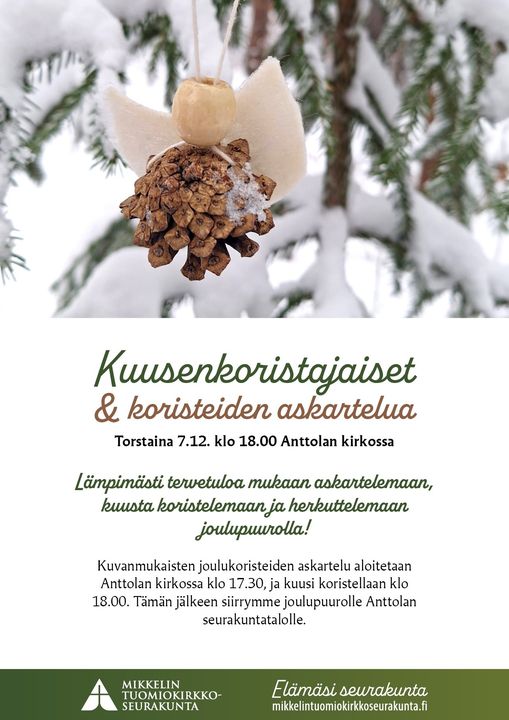 Anttolan alueseurakunnan perinteinen kuusen koristajaistilaisuus on to 7.12. klo 17.30 alkaen. Anttolan kirkossa askarrellaan koristeita, joilla koristellaan kirkon joulukuusi.