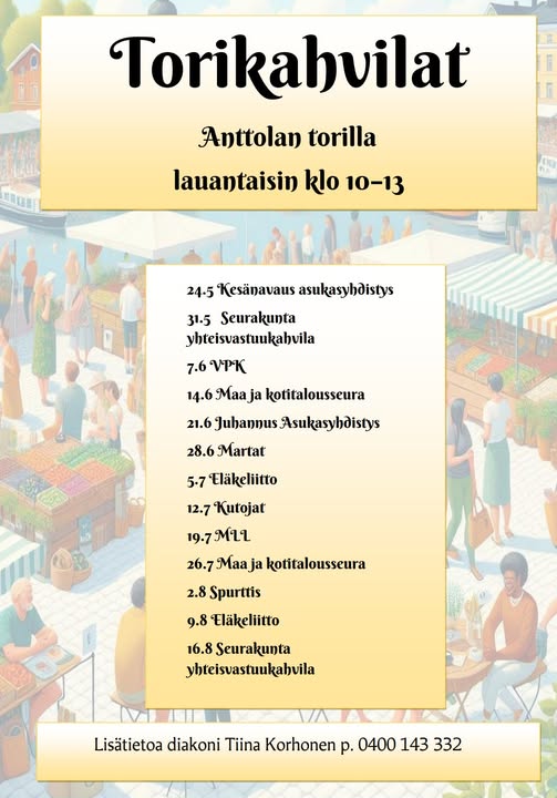 Anttolan kesän merkkejä on tietenkin torikahvilat! Tervetuloa herkuttelemaan ja tukemaan paikallista yhdistys- ja seuratoimintaa sekä yhteisvastuukeräystä, jonka tämän vuoden keräyksen kotimaan kohde ovat partiolaiset!