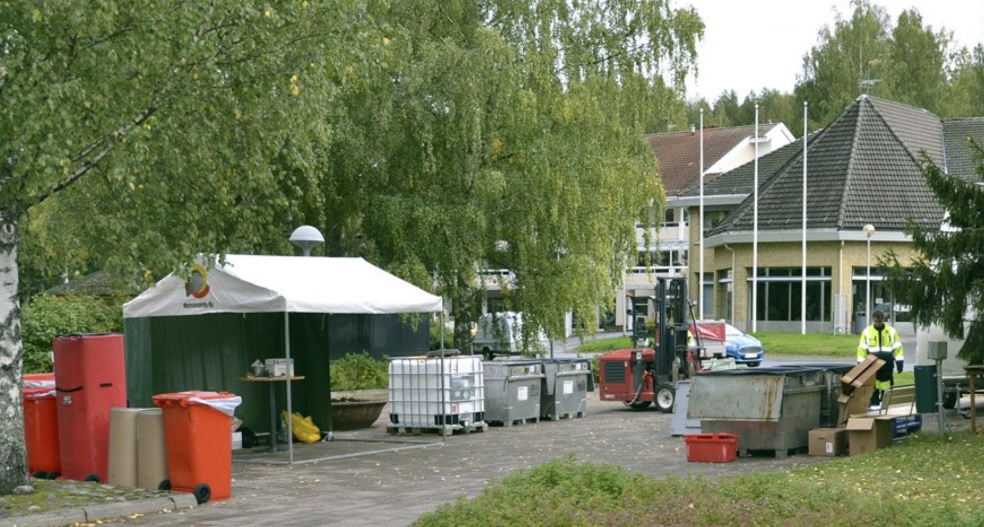 Pop up -keräys Anttolan torilla, jossa otetaan vastaan kodin vaarallisia jätteitä ja pieniä käsin kannettavia sähkölaitteita.